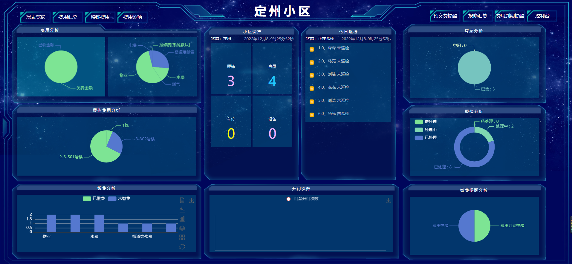 智能数据中心以物联网、大数据、云计算、人工智能、移动互联、GIS等新型数字化技术为基础,对小区的资产、缴费欠费、巡检统计、报修分析等数据进行全联接,满足社区数据分析、制作图表的需求。为社区提供端到端的数据分析解决方案,包含数据可视化、复杂式报表、数据清洗整理、数据存储、数据挖掘、数据补录、高性能计算引擎等,实现数据全融合并能报表呈现,满足社区日常数据分析的需求,使社区整体态势可感知,支撑社区更安全、更舒适、更高效地运营。